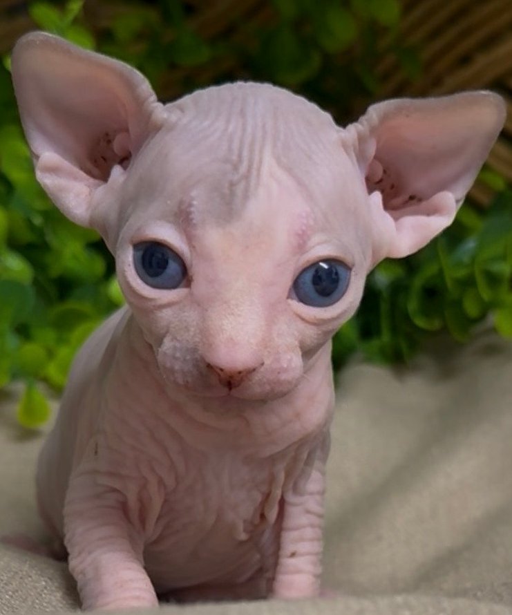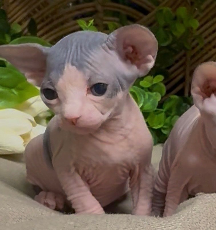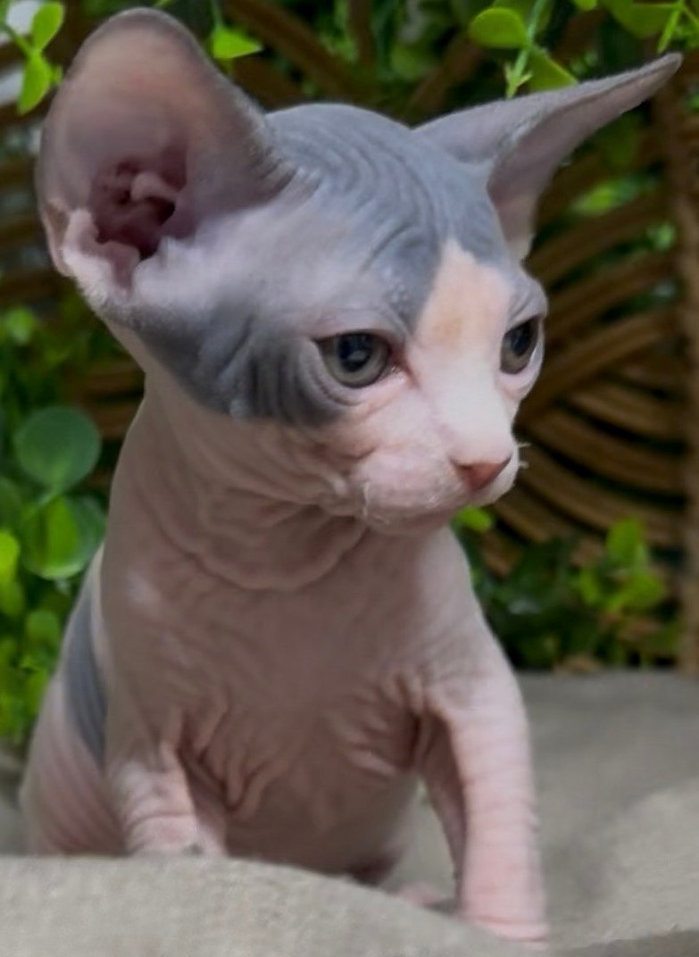 Hana carries a striking blue-gray cap pattern over her head, blending into soft pink skin throughout the body. This contrast is rare and highly sought after among Sphynx lovers. Her blue eyes and defined facial wrinkles give her a refined, show-quality look.